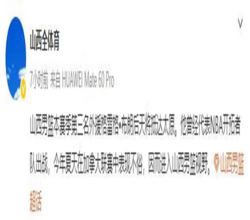格雷格-布朗是一名非常年轻的球员,今年只有24岁,身高2米01主打锋线。格雷格-布朗的能力非常全面,高中时曾被美媒评为五星高中生。在2021年的NBA选秀大会上,格雷格-布朗在次轮第43顺位被新奥尔良鹈鹕队选中,随后被交易到了开拓者。此后的三年时间里,格雷格-布朗先后在开拓者和独行侠效力,总共打了70场比赛,能够在场均出战11分钟时间里3.8分2.3个篮板的数据。在23-24赛季,格雷格-布朗跟随独行侠获得了NBA联赛的亚军。不过在赛季结束后,格雷格就离开了NBA前往加拿大打球,在今年夏天打出了非常不错的表现,引起了山西男篮的关注。经过多次沟通后,山西男篮和他完成了签约。