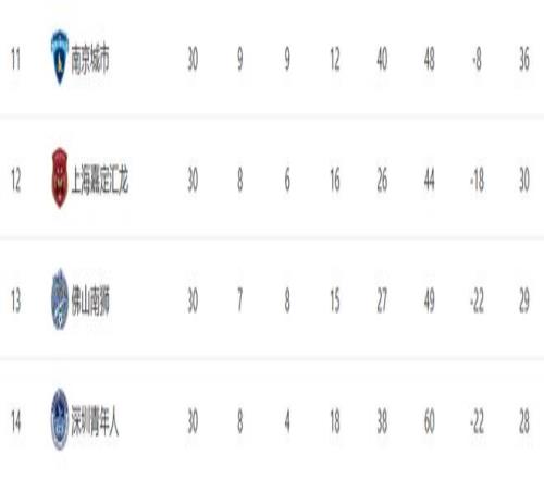 最后让我们再来看一下本赛季中甲最终的积分榜情况。