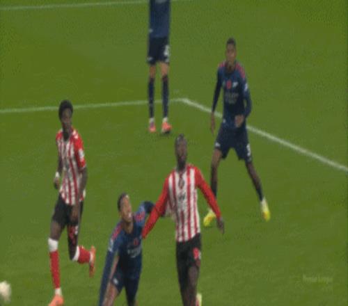 第45+2分钟,阿森纳将球传到禁区内,萨卡头球回做,无人盯防的萨利巴一脚抽射打高,错失扳平良机。