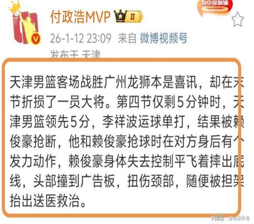 赛后,著名媒体人付政浩还原了事情真相,他在个人社媒上,详尽解读的赖俊豪受伤的过程。“龙狮本是喜讯,却在末节折损了一员大将。第四节仅剩5分钟时,天津男篮领先5分,李祥波运球单打,结果被赖俊豪抢断,他和赖俊豪抢球时在对方身后有个发力动作,赖俊豪身体失去控制平飞着摔出底线,头部撞到广告板,扭伤颈部,随便被担架抬出送医救治。”。
